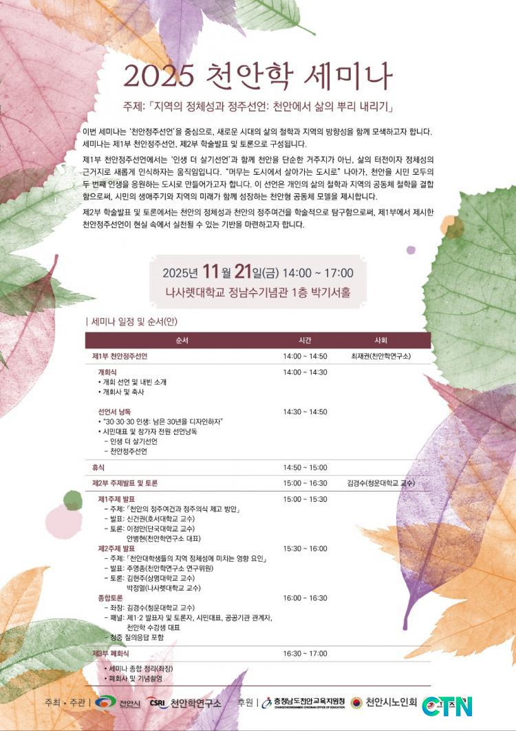 [õ¾È/CTN] °Çö¼ö ±âÀÚ = õ¾ÈÇבּ¸¼Ò´Â ¿À´Â 2025³â 11¿ù 21ÀÏ(±Ý) ¿ÀÈÄ 2½ÃºÎÅÍ 5½Ã±îÁö, ³ª»ç·¿´ëÇб³ Á¤³²¼ö±â³ä°ü 1Ãþ ¹Ú±â¼È¦¿¡¼ ¡º2025 õ¾ÈÇÐ ¼¼¹Ì³ª¡»¸¦ °³ÃÖÇÑ´Ù°í ¹àÇû´Ù.