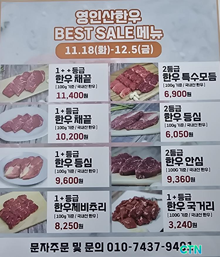 °¡Àå ÁÖ¸ñÇÒ »óǰÀº ÃÖ°í µî±ÞÀÎ 1++ µî±Þ ÇÑ¿ì 䳡À¸·Î, 100g´ç 11,400¿ø¿¡ ÆÇ¸ÅµÈ´Ù. ¶ÇÇÑ 1+ µî±Þ 䳡Àº 10,200¿ø, 1+ µî±Þ µî½ÉÀº 9,600¿ø µî ³ôÀº ǰÁúÀÇ ºÎÀ§¸¦ ÇÕ¸®ÀûÀÎ °¡°Ý¿¡ Á¦°øÇÑ´Ù.