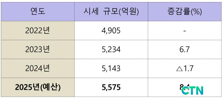 ¾Æ»ê½ÃÀÇ ¼¼ÀÔ Áõ°¡¼¼´Â ÃÖ±Ù 3³â°£ ²ÙÁØÈ÷ À̾îÁ³´Ù. ½Ã¼¼ ±Ô¸ð´Â 2022³â 4,905¾ï ¿ø, 2023³â 5,234¾ï ¿ø, 2024³â 5,143¾ï ¿ø¿¡ ÀÌ¾î ¿ÃÇØ´Â 5,575¾ï ¿øÀ» ³Ñ¾î¼°Ô µÈ °Í. ºÒ°ú 3³â »çÀÌ ¾à 670¾ï ¿øÀÌ Áõ°¡ÇÑ ¼ÀÀÌ´Ù.