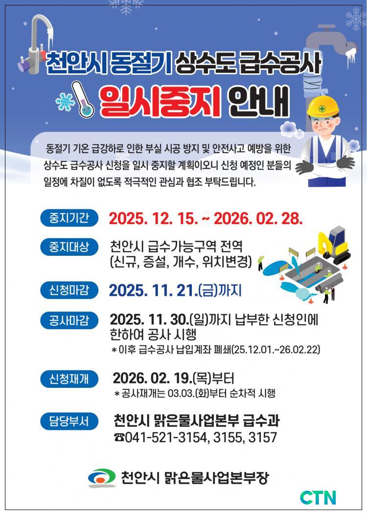 [õ¾È/CTN] °Çö¼ö ±âÀÚ = õ¾È½Ã´Â 12¿ù 15ÀϺÎÅÍ 2026³â 2¿ù 28ÀϱîÁö °Ü¿ïö »ó¼öµµ ±Þ¼ö°ø»ç¸¦ ÀϽà ÁßÁöÇÑ´Ù°í 11¿ù 19ÀÏ ¹àÇû´Ù. À̴ ȤÇѱ⠺νǽðø°ú ¾ÈÀü»ç°í¸¦ ¿¹¹æÇϱâ À§ÇÑ Á¶Ä¡·Î, ¸Å³â µ¿Àý±â¸¶´Ù ½ÃÇàµÇ´Â Á¦µµ´Ù.