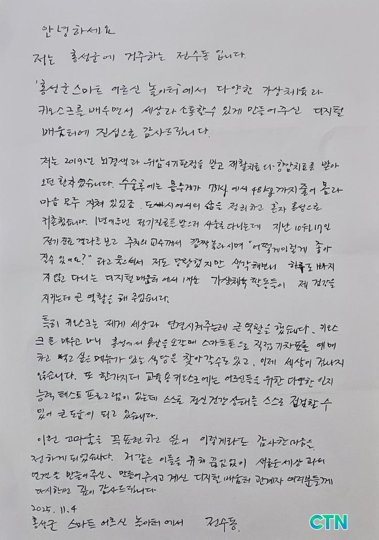 ÃÖ±Ù È«¼º±º ½º¸¶Æ® ¾î¸£½Å ³îÀÌÅÍ¿¡¼ µðÁöÅйè¿òÅÍ ±³À°À» ¼ö°ÇÑ Àü¼öµ¿(71) ¾¾´Â "µðÁöÅÐ ±â±â¸¦ ¹è¿ì¸é¼ ¼¼»ó°ú ´Ù½Ã ¿¬°áµÇ´Â ±âºÐÀ» ¹Þ¾Ò´Ù"¸ç °¨»çÀÇ ¶æÀ» ´ãÀº ÆíÁö¸¦ µµ¿¡ Àü´ÞÇß´Ù.