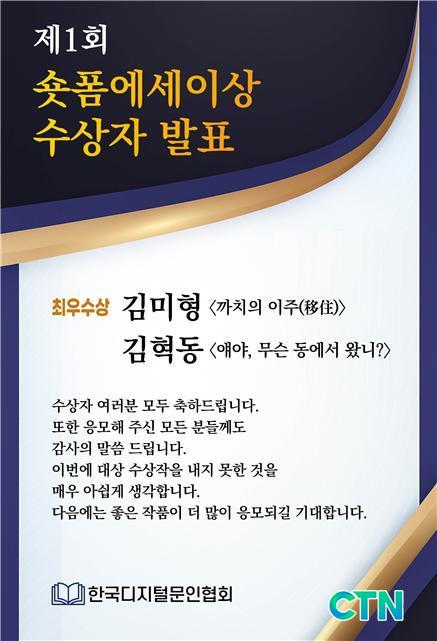 [CTN¹®Çаü]±è¿µÈñ °´¿ø±âÀÚ=Çѱ¹µðÁöÅй®ÀÎÇùȸ(ÀÌ»çÀå ÀÌ»ó¿ì, ȸÀå ±èÁ¾È¸)°¡ ÁÖÃÖÇÑ Á¦1ȸ ¼ôÆû¿¡¼¼ÀÌ»ó ¼ö»óÀÛÀÌ 11¿ù 20ÀÏ ¹ßÇ¥µÆ´Ù.
