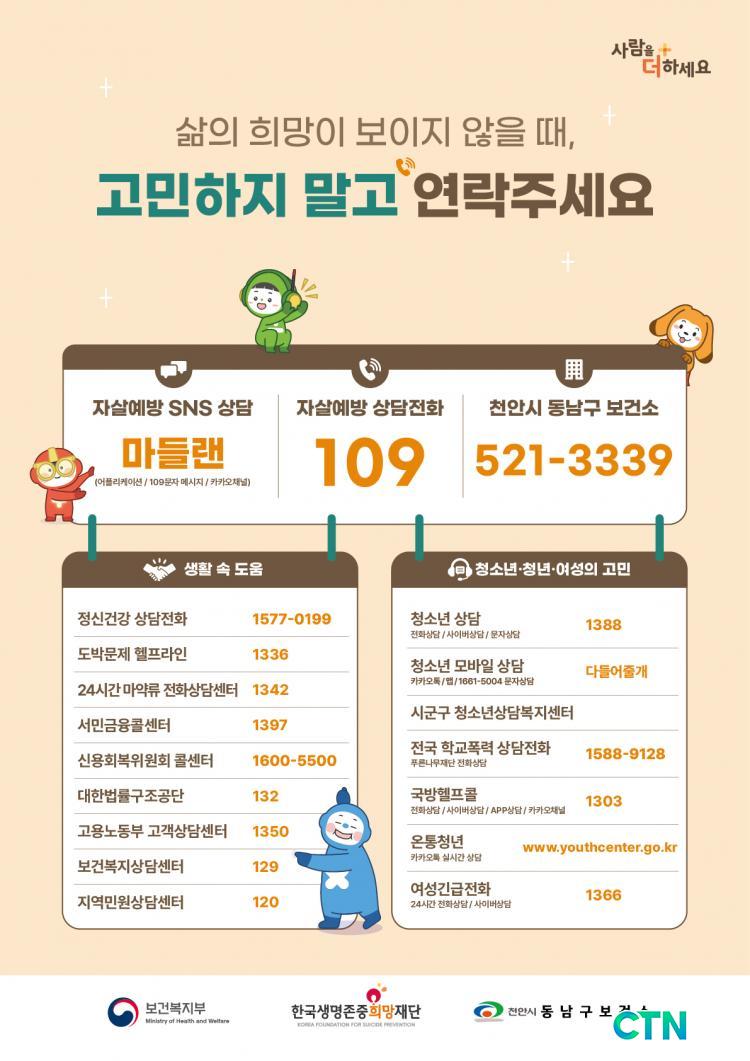 ÇÑÆí »î¿¡ Èñ¸ÁÀÌ º¸ÀÌÁö ¾ÊÀ» ¶§´Â °í¹ÎÇÏÁö ¸»°í 24½Ã Àڻ쿹¹æ »ó´ãÀüÈ(109), õ¾È½Ã µ¿³²±¸ Àڻ쿹¹æ¼¾ÅÍ(041-521-3339), ¼ºÏ±¸ Àڻ쿹¹æ¼¾ÅÍ(401-578-9709)·Î ¿¬¶ôÇϸé Àü¹®ÀûÀÎ »ó´ã°ú µµ¿òÀ» ¹ÞÀ» ¼ö ÀÖ´Ù.