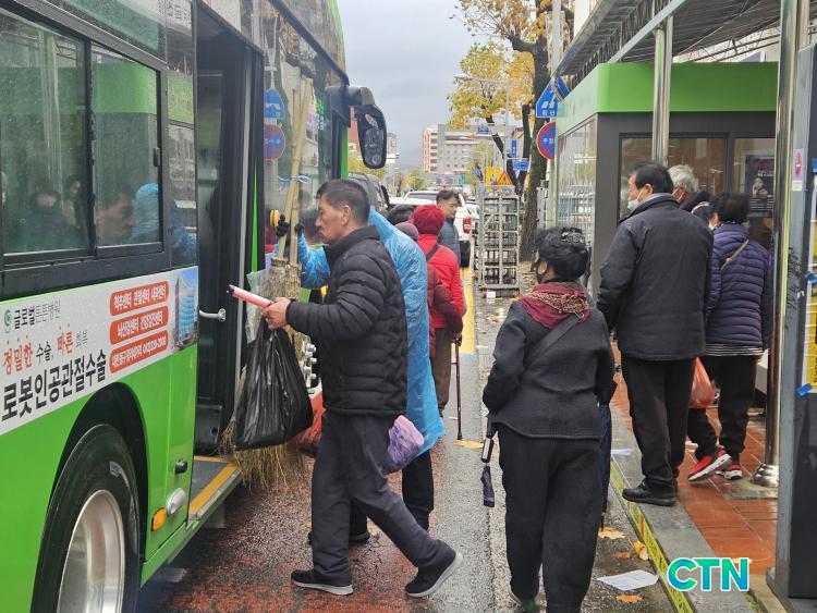 [±Ý»ê/CTN]Á¤¹ÎÁØ ±âÀÚ¤ÓÇÑÀϱ³Åë(ÁÖ) ¿îÀüÁ÷ Á÷¿øµéÀº Áö³ 27ÀÏ ±Ý»ê±ºÃ» °Ç¼³±³Åë°ú Á÷¿øµé°ú ÇÔ²² ±Ý»êÀ¾ ³óÇùÁß¾Óȸ ¾Õ ¹ö½ºÁ¤·ùÀå¿¡¼ ¹ö½º¿¡ ½ÂÂ÷ÇÏ´Â ¾î¸£½ÅÀÇ ÁüÀ» ½Ç¾îµå¸®´Â ºÀ»çȰµ¿À» Àü°³Çß´Ù.