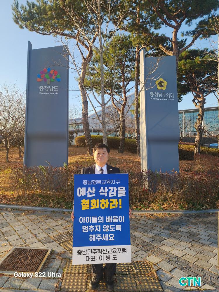 Ãæ³²µµÃ» ¾Õ¿¡¼ 'Ãæ³²Çູ±³À°Áö±¸' ¿¹»ê »è°¨ öȸ Ã˱¸ 1ÀÎ ½ÃÀ§ ÁøÇàÇϰí ÀÖ´Â À̺´µµ ´ëÇ¥ / Ãæ³²¹ÎÁÖÇõ½Å±³À°Æ÷·³ Á¦°ø