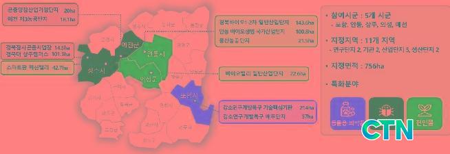 °æºÏµµ '±×¸°¹ÙÀÌ¿À»ê¾÷ Çõ½ÅÀ¶ÇÕÁö±¸'´Â ±×¸°¹ÙÀÌ¿À 6´ë ºÐ¾ß(½Äǰ, õ¿¬¹°, ¹Ì»ý¹°, °ïÃæ, Á¾ÀÚ, µ¿¹°¿ëÀǾàǰ) Áß µ¿¹°¿ë ÀǾàǰ, °ïÃæ, õ¿¬¹° 3´ë ºÐ¾ß¸¦ Æ¯È ÃßÁøÇÏ°Ô µÈ´Ù. Áö¿ªÀº Æ÷Çס¤¾Èµ¿¡¤»óÁÖ¡¤ÀǼº¡¤¿¹Ãµ 5°³ ½Ã±ºÀÌ¸ç Æ÷Ç×°¼Ò¿¬±¸°³¹ßƯ±¸ µî ÃÑ 11°³ ±â°ü°ú »ê¾÷´ÜÁö·Î ¸éÀûÀº ÃÑ 756ha·Î Àü±¹ ÃÖ´ë ±Ô¸ð´Ù.