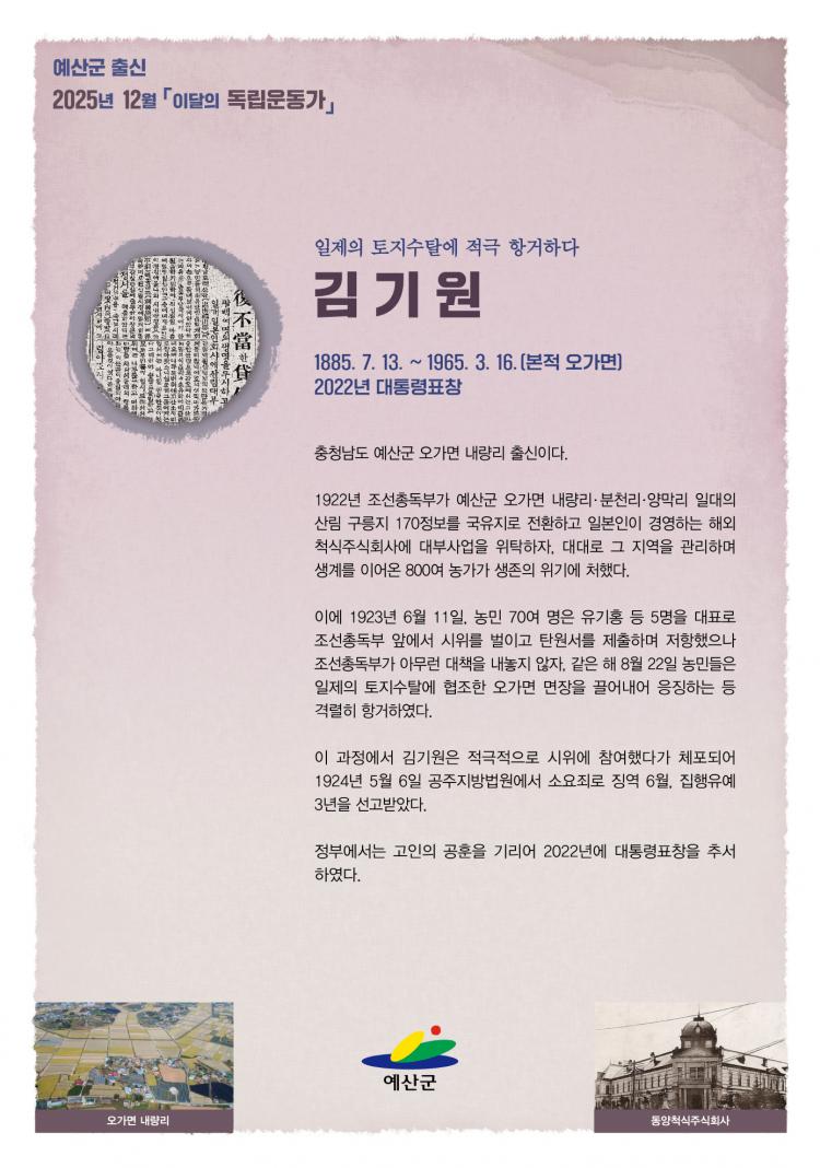 ¿¹»ê±º, 12¿ùÀÇ µ¶¸³¿îµ¿°¡·Î ¿À°¡¸é Ãâ½Å ±è±â¿ø ¼±Á¤