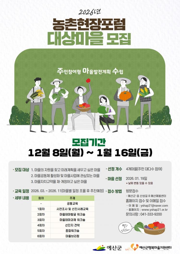 [¿¹»ê/CTN]ÃÖ¿ë°ü ±âÀÚ = ¿¹»ê±º°ú ¿¹»ê±ºÇູ¸¶À»Áö¿ø¼¾ÅÍ´Â 2026³â ÁÖ¹ÎÁÖµµ ¸¶À»¹ßÀü°èȹ¼ö¸³(³óÃÌÇöÀåÆ÷·³)¿¡ Âü¿©ÇÒ ´ë»ó¸¶À»À» ³»³â 1¿ù 16ÀϱîÁö ¸ðÁýÇÑ´Ù°í ¹àÇû´Ù.