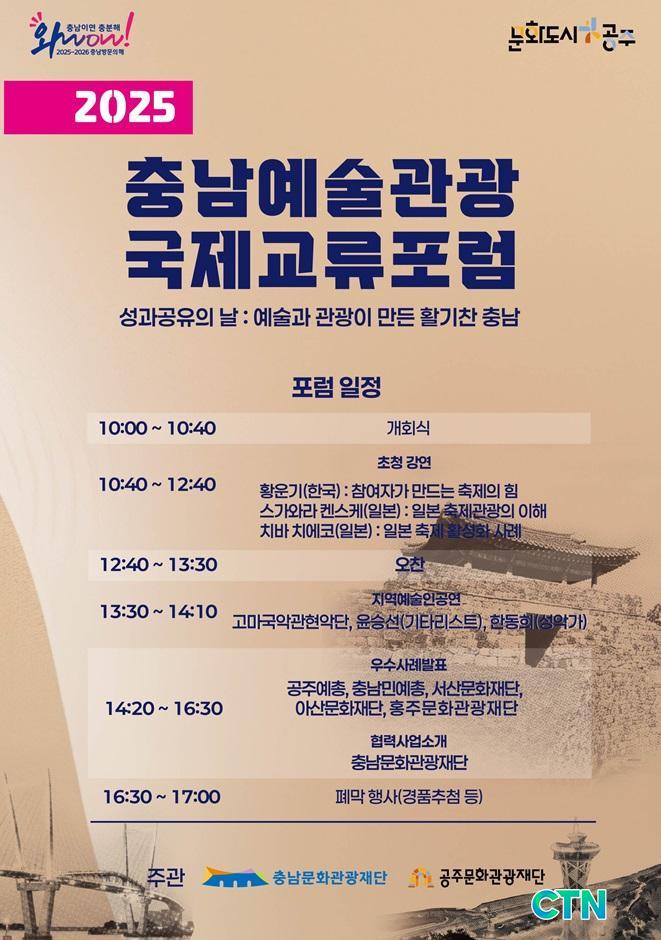 [Ãæ³²/CTN]ÇѼºÁø ±âÀÚ = Ãæ³²¹®È°ü±¤Àç´Ü(´ëÇ¥ÀÌ»ç À̱âÁø)Àº °øÁÖ¹®È°ü±¤Àç´Ü°ú(´ëÇ¥ÀÌ»ç ±èÁö±¤) °øµ¿À¸·Î 12ÀÏ ¿ÀÀü 10½Ã, Ãæ³²¿¡¼ Ȱµ¿ÇÏ´Â ¿¹¼úÀΰú °ü±¤ ½Ç¹«ÀÚ, ±¹³»¿Ü Àü¹®°¡µéÀÌ ÇÔ²²ÇÏ´Â '2025 Ãæ³² ¿¹¼ú°ü±¤ ±¹Á¦±³·ù Æ÷·³'À» °³ÃÖÇÑ´Ù°í ¹àÇû´Ù.