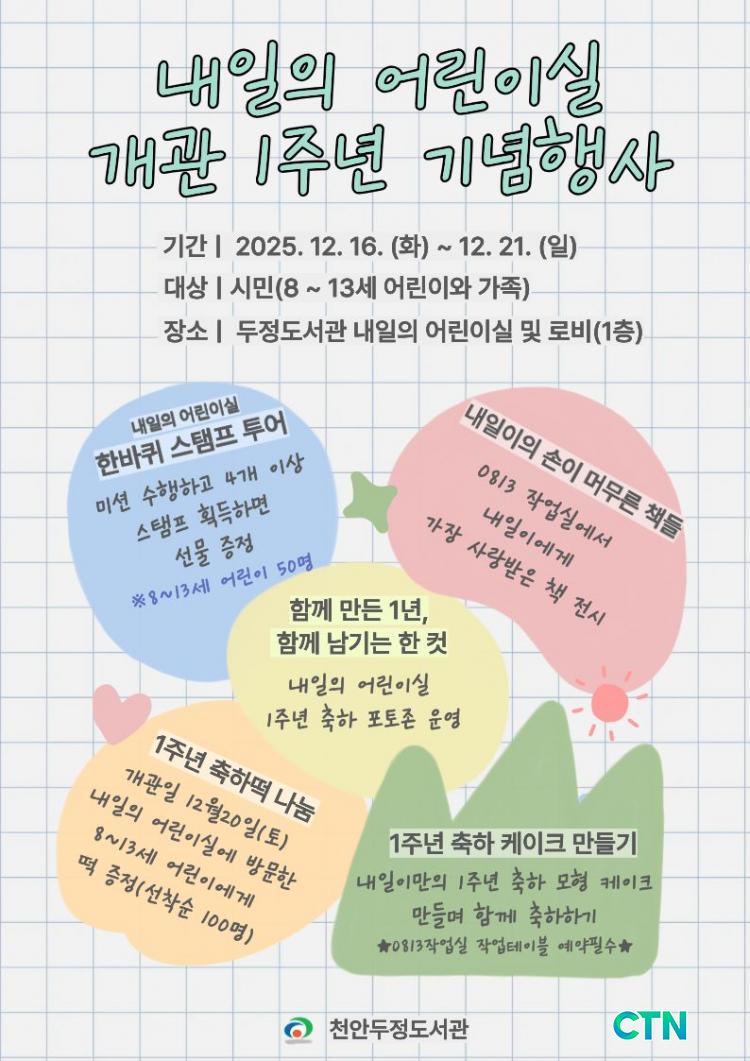 [õ¾È/CTN]°Çö¼ö ±âÀÚ = õ¾È½Ã µÎÁ¤µµ¼°üÀÌ ¾î¸°ÀÌ¿Í °¡Á·µéÀ» À§ÇÑ Æ¯º°ÇÑ ÃàÁ¦¸¦ ¸¶·ÃÇÑ´Ù. µµ¼°üÀº ¡®³»ÀÏÀÇ ¾î¸°À̽ǡ¯ °³°ü 1ÁÖ³âÀ» ¸Â¾Æ ´Ùä·Î¿î ±â³äÇà»ç¸¦ ¿î¿µÇϰí, µ¶¼ ¹®È °ø°£À¸·Î¼ÀÇ ¿ªÇÒÀ» °ÈÇÑ´Ù.