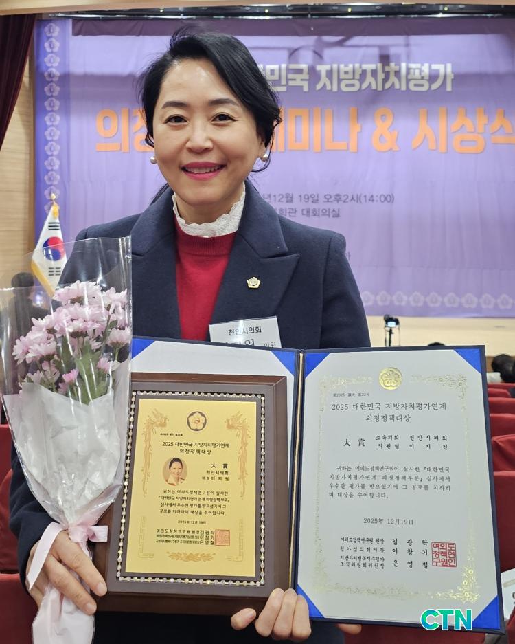 [õ¾È/CTN]°Çö¼ö ±âÀÚ = õ¾È½ÃÀÇȸ ÀÌÁö¿ø ÀÇ¿ø(±¹¹ÎÀÇÈû, ¼º°ÅÀ¾¡¤ºÎ¼º1µ¿)ÀÌ ¿©ÀǵµÁ¤Ã¥¿¬±¸¿øÀÌ ÁÖ°üÇÑ ¡®2025 ´ëÇѹα¹ Áö¹æÀÚÄ¡Æò°¡ ÀÇÁ¤Á¤Ã¥´ë»ó¡¯¿¡¼ ±âÃÊÀÇ¿ø ºÎ¹® ÃÖ°í ¿µ¿¹ÀÎ ¡®´ë»ó¡¯À» ¼ö»óÇß´Ù.