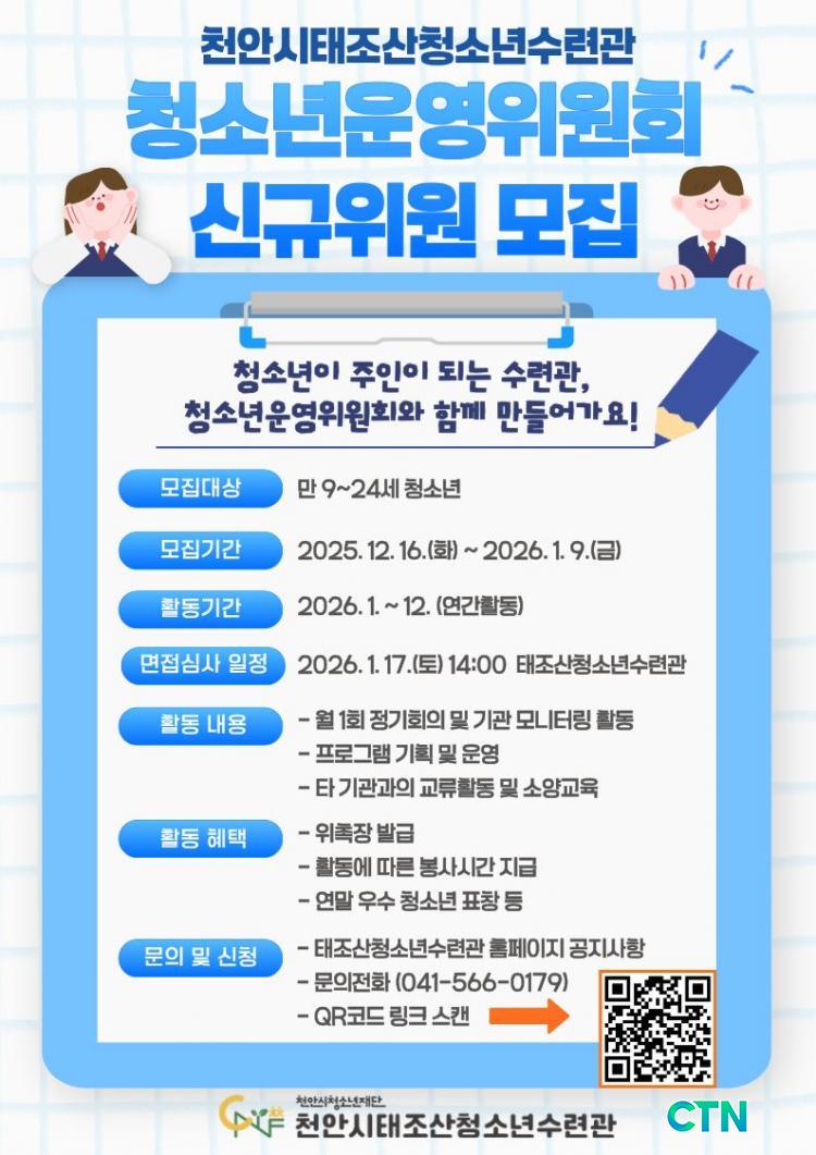 [õ¾È/CTN]°Çö¼ö ±âÀÚ = õ¾È½Ã û¼Ò³âµéÀÌ ½Ã¼³ÀÇ ÀÌ¿ëÀÚ¸¦ ³Ñ¾î ¿î¿µÀÇ ÁÖü·Î Âü¿©ÇÒ ¼ö ÀÖ´Â ±æÀÌ ¿¸°´Ù. (Àç)õ¾È½Ãû¼Ò³âÀç´Ü õ¾È½ÃÅÂÁ¶»êû¼Ò³â¼ö·Ã°üÀº ³»³â 1¿ù 9ÀϱîÁö ¡®2026³â û¼Ò³â¿î¿µÀ§¿øÈ¸¡¯ ½Å±Ô À§¿øÀ» ¸ðÁýÇÑ´Ù°í 24ÀÏ ¹àÇû´Ù.