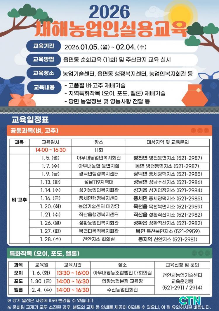 [õ¾È/CTN]°Çö¼ö ±âÀÚ = õ¾È½Ã³ó¾÷±â¼ú¼¾ÅͰ¡ 2026³â »õÇØ ³ó»ç ¼³°è¸¦ µ½°í Áö¿ª ³ó¾÷ÀÎÀÇ °æÀï·ÂÀ» °ÈÇϱâ À§ÇØ º»°ÝÀûÀÎ ±³À° ÇöÀåÀ¸·Î ³ª¼±´Ù. ¼¾ÅÍ´Â ³»³â 1¿ù 5ÀϺÎÅÍ 2¿ù 4ÀϱîÁö °ü³» ³ó¾÷ÀÎ 750¸íÀ» ´ë»óÀ¸·Î ¡®»õÇØ³ó¾÷Àνǿ뱳À°¡¯À» ÃßÁøÇÑ´Ù°í 26ÀÏ ¹àÇû´Ù.