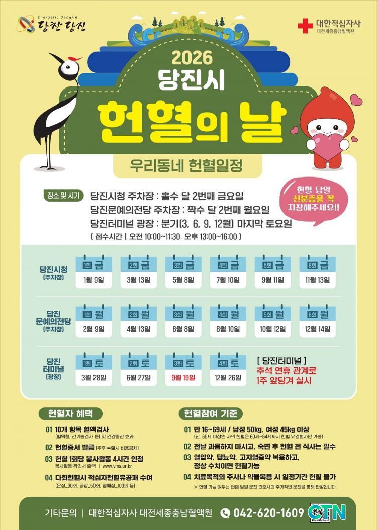 [´çÁø/CTN]°¡±ÝÇö ±âÀÚ = ´çÁø½Ãº¸°Ç¼Ò(¼ÒÀå ¹ÚÁ¾±Ô)´Â ¾ÈÁ¤ÀûÀÎ Ç÷¾× ¼ö±Þ°ú ½Ã¹Î Âü¿© Ȱ¼ºÈ¸¦ À§ÇØ 2026³âºÎÅÍ 'ÇåÇ÷ÀÇ ³¯(´ëÇÑÀû½ÊÀÚ»ç ÇåÇ÷ ¹ö½º ¿î¿µ)' ÀÏÁ¤ Áß ´çÁø½Ãû ¿î¿µ ¿äÀÏÀ» º¯°æÇÑ´Ù°í 26ÀÏ ¹àÇû´Ù.