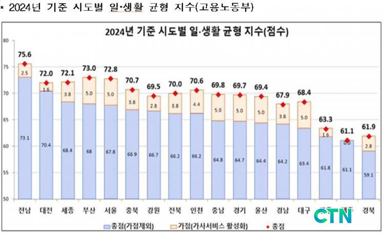 2024³â ÀÏ¡¤»ýȰ ±ÕÇüÁö¼ö Æò°¡ °á°ú, Àü±¹ 17°³ ½Ã¡¤µµ Æò±ÕÀº 65.7Á¡À̸ç Àü³²Àº À̺¸´Ù 7.4Á¡ ³ô¾ÒÀº Á¡¼ö¸¦ ±â·ÏÇß´Ù. 2023³â°ú ºñ±³Çصµ 9.3Á¡ »ó½ÂÇß´Ù.