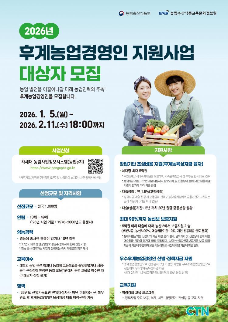[õ¾È/CTN]°Çö¼ö ±âÀÚ = õ¾È½Ã°¡ Áö¿ª ³ó¾÷ÀÇ ¹é³â´ë°è¸¦ Áû¾îÁú À¯¸Á ÀÎÀç ¹ß±¼°ú À°¼ºÀ» À§ÇØ ¡®2026³â Èİè³ó¾÷°æ¿µÀÎ À°¼º»ç¾÷¡¯ ´ë»óÀÚ¸¦ ³»´Þ 11ÀϱîÁö ¸ðÁýÇÑ´Ù. À̹ø »ç¾÷Àº ¿µ³ó â¾÷À» Èñ¸ÁÇϰųª Ãʱ⠴ܰ迡 ÀÖ´Â ÀþÀº ³ó¾÷Àε鿡°Ô Àڱݰú ±³À°À» Á¾ÇÕÀûÀ¸·Î Áö¿øÇØ, ³óÃÌ °í·ÉÈ ¹®Á¦¸¦ ÇØ°áÇϰí Àü¹®¼ºÀ» °®Ãá Á¤¿¹ ³ó¾÷ ÀηÂÀ» À°¼ºÇϱâ À§ÇØ ÃßÁøµÈ´Ù.