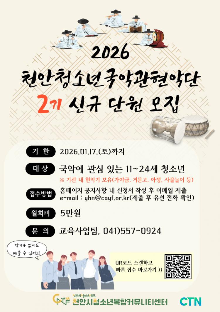 [õ¾È/CTN]°Çö¼ö ±âÀÚ = õ¾È½Ã û¼Ò³âµéÀÌ À½¾ÇÀ» ÅëÇØ ²ÞÀ» Ű¿ì°í Áö¿ª»çȸ¿¡ ¿¹¼úÀû ¿Â±â¸¦ ÀüÇÏ´Â ÁÖ¿ªÀ¸·Î °Åµì³¯ ±âȸ°¡ ¿¸°´Ù. (Àç)õ¾È½Ãû¼Ò³âÀç´Ü »êÇÏ Ãµ¾È½Ãû¼Ò³âº¹ÇÕÄ¿¹Â´ÏƼ¼¾ÅÍ´Â Áö¿ª ¹®È¿¹¼ú Ȱ¼ºÈ¿Í Â÷¼¼´ë ÀÎÀç ¾ç¼ºÀ» À§ÇØ ¡®Ãµ¾Èû¼Ò³â±¹¾Ç°üÇö¾Ç´Ü¡¯°ú ¡®Ãµ¾Èû¼Ò³â¿ÀÄɽºÆ®¶ó¡¯ÀÇ 2026³â ½Å±Ô ´Ü¿øÀ» ¸ðÁýÇÑ´Ù°í ¹àÇû´Ù.