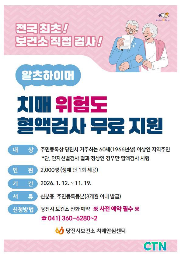 [´çÁø/CTN]°¡±ÝÇö ±âÀÚ = ´çÁø½Ã(½ÃÀå ¿À¼ºÈ¯)´Â 60¼¼ ÀÌ»ó Áö¿ª ÁÖ¹ÎÀ» ´ë»óÀ¸·Î 2026³âµµ ¾ËÃ÷ÇÏÀÌ¸Ó À§Çèµµ Ç÷¾×°Ë»ç Áö¿ø»ç¾÷À» 12ÀϺÎÅÍ ½ÃÇàÇÑ´Ù°í ¹àÇû´Ù.