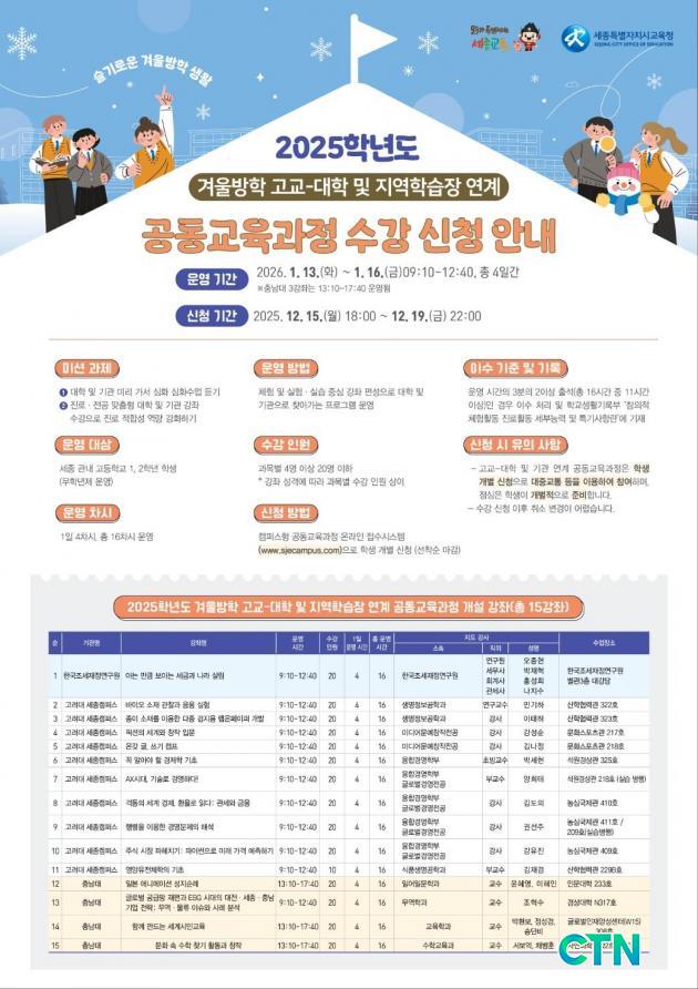 [¼¼Á¾/CTN]Á¤¹ÎÁØ ±âÀÚ¤Ó¼¼Á¾½Ã±³À°Ã»Àº 2025Çг⵵ °Ü¿ï¹æÇÐÀ» ¸Â¾Æ °í±³–´ëÇÐ ¹× Áö¿ªÇнÀÀå ¿¬°è °øµ¿±³À°°úÁ¤À» 13ÀϺÎÅÍ 16ÀϱîÁö 4Àϰ£ °í·Á´ëÇб³ ¼¼Á¾Ä·ÆÛ½º, Ãæ³²´ëÇб³, Çѱ¹Á¶¼¼ÀçÁ¤¿¬±¸¿ø µî 3°³ ±â°ü¿¡¼ ¿î¿µÇÑ´Ù.