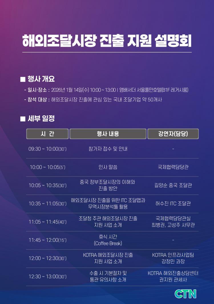 À̹ø ¼³¸íȸ´Â '25³â °ø°øÁ¶´Þ¼öÃâ»ó´ãȸ(GPPM) ÈļÓÀ¸·Î, ¿ì¸®±â¾÷ÀÇ ÇØ¿ÜÁ¶´Þ½ÃÀå ÁøÃâÀ» Àå·ÁÇÏ°í °ü·Ã Áö¿ø»ç¾÷ÀÇ Á¤º¸¸¦ Á¦°øÇϱâ À§ÇØ ÁøÇàµÆ´Ù.