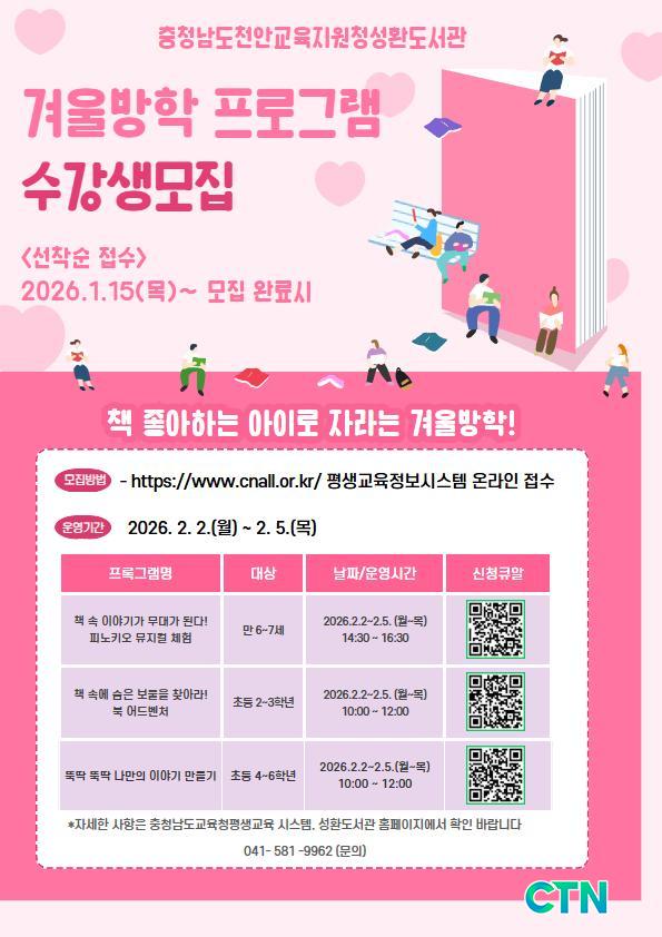 À̹ø µ¶¼±³½ÇÀº ¹æÇÐ ±â°£ ÀÚÄ© ¼ÒÈ¦ÇØÁú ¼ö ÀÖ´Â µ¶¼ ½À°üÀ» Àâ¾ÆÁÖ´Â µ¿½Ã¿¡, µµ¼°üÀ» Ä£¼÷ÇÑ ³îÀÌÅÍÀÌÀÚ ¹è¿òÅÍ·Î ÀνÄÇÏ°Ô ÇÏ´Â Áß¿äÇÑ °è±â°¡ µÉ °ÍÀ¸·Î º¸ÀδÙ. ƯÈ÷ ¿¬·É´ëº°·Î Â÷º°ÈµÈ üÇè Á᫐ ÄÜÅÙÃ÷´Â ¾ÆÀ̵éÀÌ Á¤ÀûÀÎ µ¶¼¿¡¼ ¹þ¾î³ª µ¿ÀûÀΠâÀÇ È°µ¿À¸·Î ³ª¾Æ°¡´Â ¹ßÆÇÀÌ µÉ Àü¸ÁÀÌ´Ù. Âü°¡¸¦ Èñ¸ÁÇÏ´Â ½Ã¹ÎÀº ¼ºÈ¯µµ¼°ü ´©¸®Áý(shlib.cne.go.kr)À» ÅëÇØ ½ÅûÇϰųª ÀüÈ(041-581-9962)¸¦ ÅëÇØ ÀÚ¼¼ÇÑ ¾È³»¸¦ ¹ÞÀ» ¼ö ÀÖ´Ù.