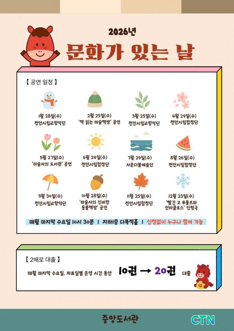 [õ¾È/CTN] °Çö¼ö ±âÀÚ = Á¤ÀûÀÎ µ¶¼ °ø°£À¸·Î ÀνĵǴø µµ¼°üÀÌ ¸Å´Þ ¸¶Áö¸· ÁÖ ¼ö¿äÀÏÀÌ¸é ½Ã¹ÎµéÀÇ ¿À°¨À» ÀÚ±ØÇÏ´Â ¿ªµ¿ÀûÀÎ º¹ÇÕ¹®È¿¹¼ú °ÅÁ¡À¸·Î Å»¹Ù²ÞÇÑ´Ù. õ¾È½Ã Áß¾Óµµ¼°üÀº ½Ã¹ÎµéÀÇ ÀÏ»ó ¼Ó ¹®È ÇâÀ¯ ±âȸ¸¦ È®´ëÇÏ°í µµ¼°ü ÀÌ¿ë Ȱ¼ºÈ¸¦ µµ¸ðÇϱâ À§ÇØ ¡®2026 ¹®È°¡ ÀÖ´Â ³¯¡¯ ÇÁ·Î±×·¥À» º»°Ý ¿î¿µÇÑ´Ù°í 19ÀÏ ¹àÇû´Ù. À̹ø ÇÁ·Î±×·¥Àº ´Ü¼øÈ÷ Ã¥À» ºô·Áº¸´Â °ø°£À» ³Ñ¾î, Ã¥°ú °ø¿¬ÀÌ À¯±âÀûÀ¸·Î °áÇÕÇÑ Â÷º°ÈµÈ ¹®È ÄÜÅÙÃ÷¸¦ Á¦°øÇÔÀ¸·Î½á ½Ã¹Îµé¿¡°Ô ±íÀÌ ÀÖ´Â Àι®ÇÐÀû °æÇèÀ» ¼±»çÇÒ °èȹÀÌ´Ù.