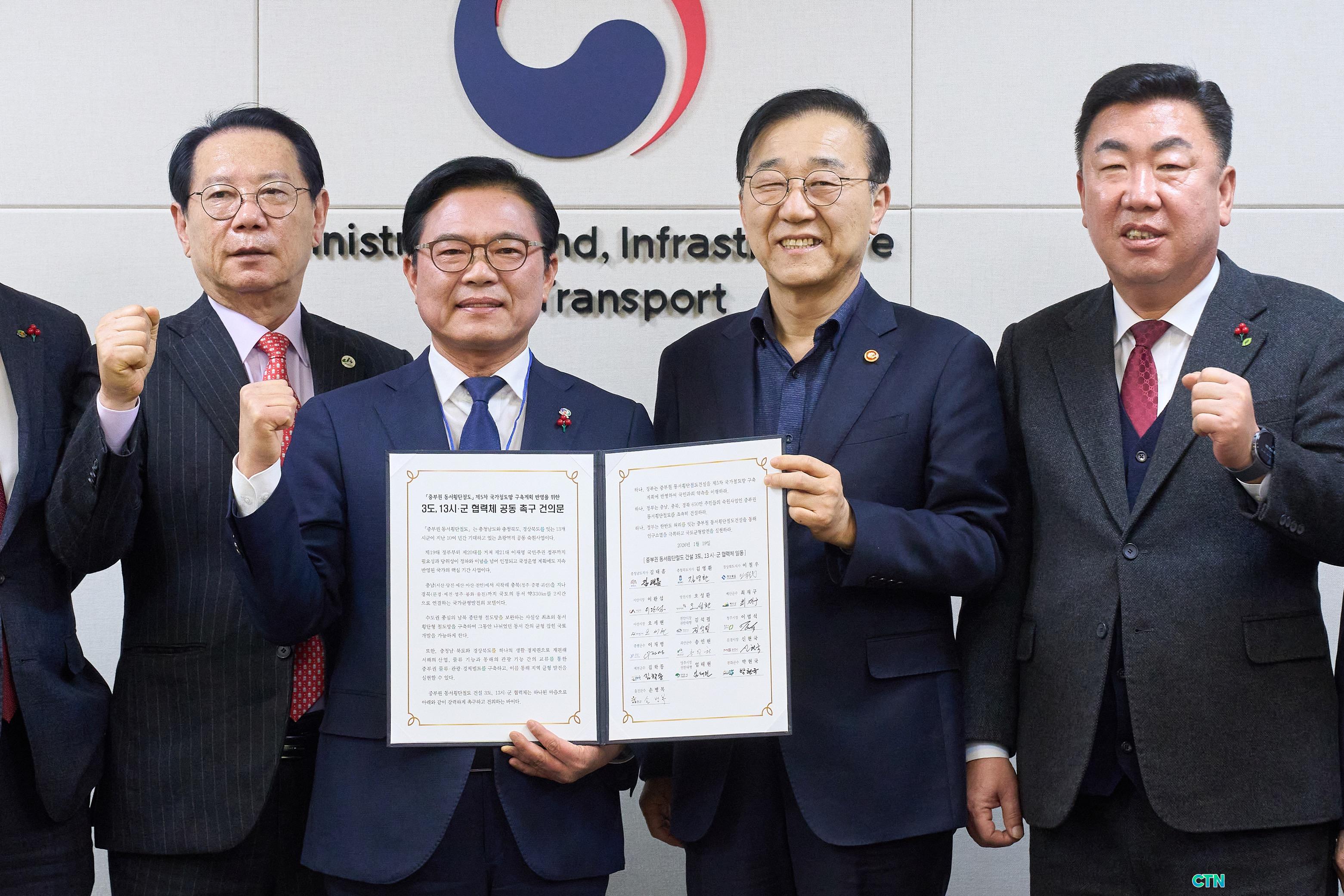 [õ¾È/CTN] °Çö¼ö ±âÀÚ = ³²ºÏÀ¸·Î¸¸ ½ò·ÁÀÖ´ø ´ëÇѹα¹ öµµ Áöµµ°¡ µ¿¼·Î °¡·ÎÁö¸£´Â »õ·Î¿î Çõ¸íÀÇ ±â·Î¿¡ ¼¹´Ù. õ¾È½Ã¸¦ ºñ·ÔÇÑ Ãæ³²¡¤ÃæºÏ¡¤°æºÏ 3°³ µµÀÇ 13°³ ½Ã±º Çù·Âü°¡ ÁßºÎ±Ç µ¿¼È¾´ÜöµµÀÇ ±¹°¡Ã¶µµ¸Á ±¸Ãà°èȹ ¹Ý¿µÀ» À§ÇØ ÃÖÈÄÀÇ ÃÑ·Â ´ëÀÀ¿¡ ³ª¼¹´Ù. Çù·Âü´Â 19ÀÏ ±¹Åä±³ÅëºÎ¸¦ ¹æ¹®ÇØ Á¦5Â÷ ±¹°¡Ã¶µµ¸Á ±¸Ãà°èȹ ½Å±Ô »ç¾÷ ¹Ý¿µÀ» °·ÂÈ÷ Ã˱¸ÇÏ´Â °øµ¿°ÇÀǹ®À» Á¦ÃâÇϸç, 650¸¸ ÁßºÎ±Ç ½Ãµµ¹ÎÀÇ °£ÀýÇÑ ¿¸ÁÀ» Áß¾ÓÁ¤ºÎ¿¡ Àü´ÞÇß´Ù.