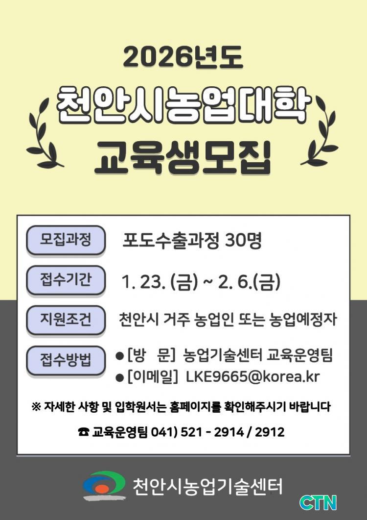 [õ¾È/CTN] °Çö¼ö ±âÀÚ = õ¾È½Ã°¡ Áö¿ª ³ó¾÷ÀÇ ¹Ì·¡¸¦ À̲ø Á¤¿¹ Àü¹®°¡¸¦ ¾ç¼ºÇϱâ À§ÇØ 2026³âµµ ³ó¾÷´ëÇÐ ±³À°»ý ¸ðÁýÀ» ½ÃÀÛÇß´Ù. õ¾È½Ã³ó¾÷±â¼ú¼¾ÅÍ´Â Æ÷µµ ¼öÃâ È®´ë¿Í ³ó°¡ °æÀï·Â °È¸¦ À§ÇØ ¸¶·ÃµÈ 2026³âµµ ³ó¾÷´ëÇÐ Æ÷µµ¼öÃâ °úÁ¤ÀÇ ±³À°»ý 30¸íÀ» ¿À´Â 2¿ù 6ÀϱîÁö ¸ðÁýÇÑ´Ù°í 23ÀÏ ¹àÇû´Ù.