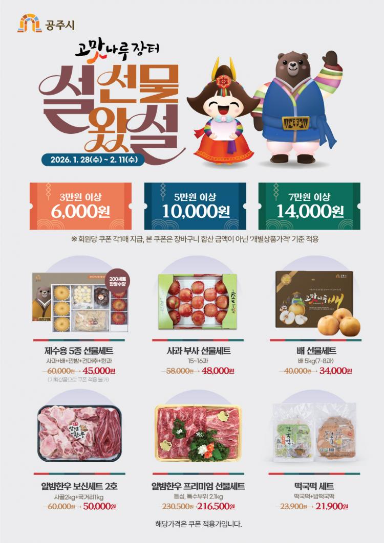 [°øÁÖ/CTN]ÀÌÀºÃá ±âÀÚ = °øÁÖ½Ã(½ÃÀå ÃÖ¿øÃ¶)°¡ Á÷Á¢ ¿î¿µÇÏ´Â ³ó¡¤Æ¯»ê¹° ¿Â¶óÀÎ ÆÇ¸Å ¼îÇθô '°í¸À³ª·çÀåÅÍ'´Â ¼³ ¸íÀýÀ» ¸Â¾Æ 1¿ù 28ÀϺÎÅÍ 2¿ù 11ÀϱîÁö 15Àϰ£ Ưº° ÇÒÀÎ ±âȹÀüÀ» ½Ç½ÃÇÑ´Ù.