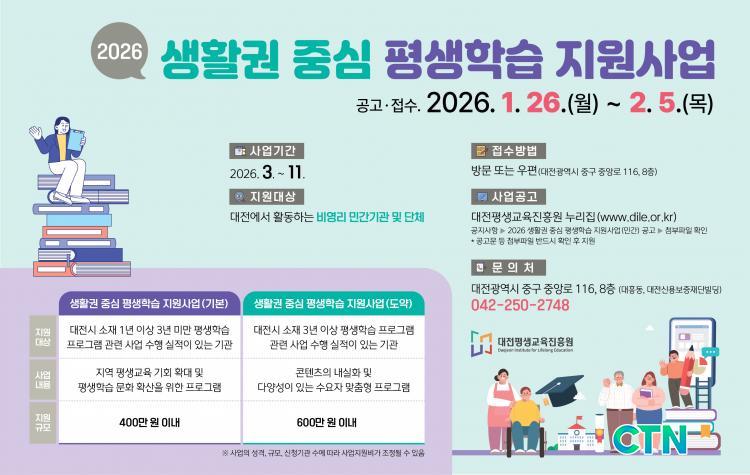 [´ëÀü/CTN]Á¤¹ÎÁØ ±âÀÚ¤Ó´ëÀüÆò»ý±³À°ÁøÈï¿øÀº '2026³â »ýȰ±ÇÁ߽ɯò»ýÇнÀÁö¿ø»ç¾÷'¿¡ Âü¿©ÇÒ ±â°ü¡¤´Üü¸¦ 2¿ù 2ÀϺÎÅÍ 5ÀϱîÁö ¸ðÁýÇÑ´Ù.