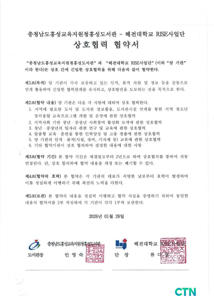 [±³À°/CTN]ÇѼºÁø ±âÀÚ = ÃæÃ»³²µµÈ«¼º±³À°Áö¿øÃ»È«¼ºµµ¼°ü(°üÀå ¾È¿µ¼÷)Àº Áö³ 28ÀÏ ÇýÀü´ëÇб³ RISE»ç¾÷´Ü°ú Áö¿ª ±³À° Çù·Â °È¸¦ À§ÇÑ ¾÷¹«Çù¾àÀ» ü°áÇß´Ù.