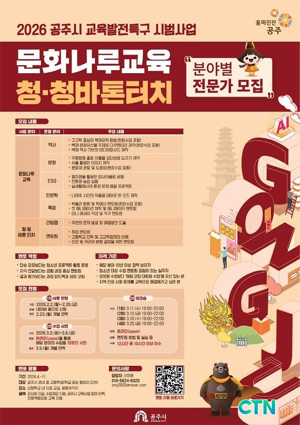 [°øÁÖ/CTN]ÀÌÀºÃá ±âÀÚ = °øÁÖ½Ã(½ÃÀå ÃÖ¿øÃ¶)´Â °øÁֽà ±³À°¹ßÀüƯ±¸ ½Ã¹ü»ç¾÷À» º»°Ý ÃßÁøÇϱâ À§ÇØ Ã»¼Ò³â¿¡°Ô ÇöÀå Á᫐ ¸àÅ丵À» Á¦°øÇÒ '¹®È³ª·ç±³À°'°ú 'û-û ¹ÙÅæ ÅÍÄ¡' ºÐ¾ßº° Àü¹®°¡¸¦ ¸ðÁýÇÑ´Ù.
