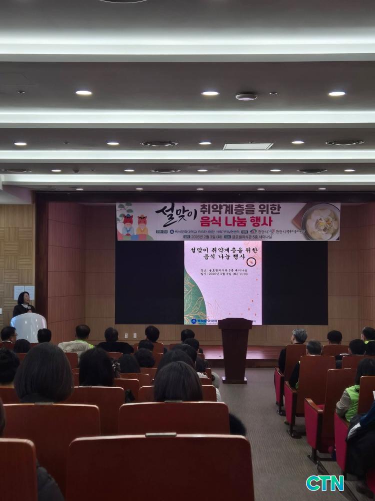 ÃÖÀç¿ë ´ëÅë·ÉÁ÷¼Ó Áö¹æ½Ã´ëÀ§¿øÈ¸ À§¿øÀÌ Áö³ 3ÀÏ ¹é¼®¹®È´ëÇб³¿¡¼ ¿¸° ¡®¼³¸ÂÀÌ Ãë¾à°èÃþÀ» À§ÇÑ À½½Ä ³ª´® Çà»ç¡¯¿¡ Âü¼®ÇØ ¼ÒÅë Çຸ¸¦ À̾´Ù. À̹ø Çà»ç´Â ¹é¼®´ëÇб³ ¶óÀÌÁî(RISE) »ç¾÷´Ü°ú õ¾È½Ã, ÇູŰ¿òÁö¿ø´Ü µîÀÌ °øµ¿À¸·Î ÁغñÇÏ¿© Áö¿ª ³» ¾î·Á¿î ÀÌ¿ôµé¿¡°Ô ¸íÀýÀÇ ¿Â±â¸¦ ÀüÇϱâ À§ÇØ ¸¶·ÃµÆ´Ù. ÇöÀåÀ» ãÀº ÃÖ À§¿øÀº Á¤¼º²¯ À½½ÄÀ» ÁغñÇÏ´Â °ü°èÀÚµé°ú ºÀ»çÀÚµéÀ» ÀÏÀÏÀÌ °Ý·ÁÇÏ¸ç ³ª´®ÀÇ Àǹ̸¦ °øÀ¯Çß´Ù.