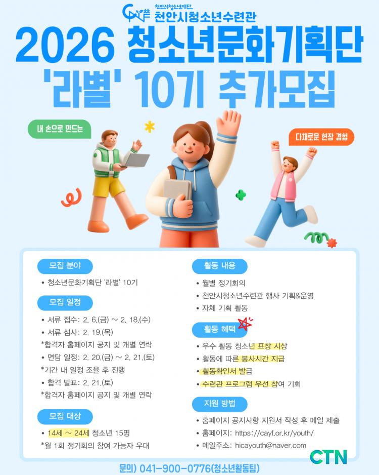 (Àç)õ¾È½Ãû¼Ò³âÀç´Ü õ¾È½Ãû¼Ò³â¼ö·Ã°üÀº û¼Ò³âµéÀÌ ÁÖüÀûÀ¸·Î Áö¿ª ¹®È ÄÜÅÙÃ÷¸¦ ¹ß±¼ÇÏ°í ¿î¿µÇÏ´Â ¡®2026 û¼Ò³â¹®È±âȹ´Ü ¶óº° 10±â ´Ü¿ø¡¯À» ¿À´Â 2¿ù 18ÀϱîÁö Ãß°¡ ¸ðÁýÇÑ´Ù°í 7ÀÏ ¹àÇû´Ù. À̹ø Ãß°¡ ¸ðÁýÀº 14¼¼ºÎÅÍ 24¼¼ »çÀÌÀÇ Ã»¼Ò³â 15¸íÀ» ´ë»óÀ¸·Î ÁøÇàµÈ´Ù. ¼±¹ßµÈ ¡®¶óº°¡¯ 10±â ´Ü¿øµéÀº ¹®È ±âȹÀڷμ ¼ö·Ã°ü ³» û¼Ò³â Ȱµ¿À» Á÷Á¢ ±âȹÇϰí ÇöÀå¿¡¼ ¿î¿µÇÏ¸ç ´Ùä·Î¿î ½Ç¹« °æÇèÀ» ½×°Ô µÈ´Ù.