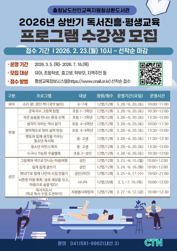 ÃæÃ»³²µµÃµ¾È±³À°Áö¿øÃ»¼ºÈ¯µµ¼°üÀÌ ½Ã¹ÎµéÀÇ ÁöÀû ¼ºÃë¿Í Á¤¼Àû dz¿ä¸¦ À§ÇØ ¡®2026³â »ó¹Ý±â µ¶¼ÁøÈÆò»ý±³À° ÇÁ·Î±×·¥¡¯ ¼ö°»ýÀ» ¸ðÁýÇÑ´Ù°í 9ÀÏ ¹àÇû´Ù. À̹ø ¸ðÁýÀº ¿À´Â 2¿ù 23ÀÏ ¿ÀÀü 10½ÃºÎÅÍ Æò»ý±³À°Á¤º¸½Ã½ºÅÛÀ» ÅëÇØ ¼±Âø¼øÀ¸·Î ÁøÇàµÈ´Ù.