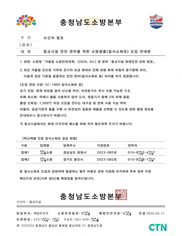 20ÀÏ µµ ¼Ò¹æº»ºÎ¿¡ µû¸£¸é, ÃÖ±Ù µµ³» Á¾±³½Ã¼³À» ´ë»óÀ¸·Î "¼Ò¹æÃ»ÀÇ '°Ü¿ïö ¼Ò¹æ¾ÈÀü´ëÃ¥'¿¡ µû¶ó Áú½Ä¼ÒÈÆ÷ µîÀ» Àǹ«ÀûÀ¸·Î ºñÄ¡ÇØ¾ß ÇÑ´Ù"´Â ³»¿ëÀÇ À§Á¶ °ø¹®À» º¸³»°í ±¸¸Å À¯µµ ¹®ÀÚ¸¦ Àü¼ÛÇÑ ÀÏÀÌ ¹ß»ýÇß´Ù.