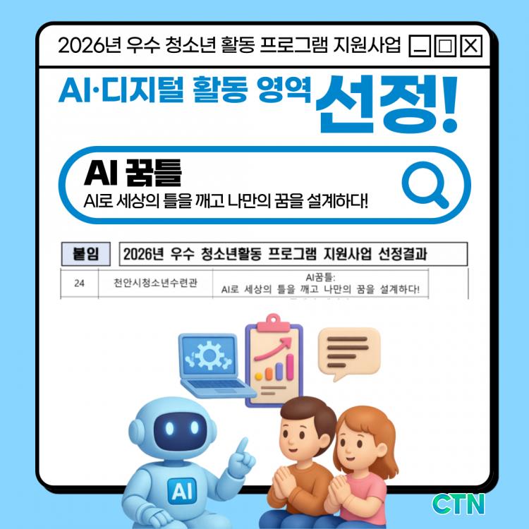 [õ¾È/CTN] °Çö¼ö ±âÀÚ = õ¾È½Ãû¼Ò³âÀç´Ü õ¾È½Ãû¼Ò³â¼ö·Ã°üÀÇ ¡®AI²ÞƲ¡¯ÀÌ 2026³â Çѱ¹Ã»¼Ò³âȰµ¿ÁøÈï¿ø ¿ì¼ö û¼Ò³âȰµ¿ ÇÁ·Î±×·¥ Áö¿ø»ç¾÷¿¡ ¼±Á¤µÇ´Â Äè°Å¸¦ ÀÌ·ð´Ù. õ¾È½Ãû¼Ò³â¼ö·Ã°üÀº À̹ø °ø¸ð ¼±Á¤À» ÅëÇØ Áö¿ª û¼Ò³âµé¿¡°Ô ´õ¿í Àü¹®ÀûÀ̰í ü°èÀûÀÎ µðÁöÅÐ ±â¹Ý Ȱµ¿À» Á¦°øÇÒ ¼ö ÀÖ°Ô µÆ´Ù°í 21ÀÏ ¹àÇû´Ù.
