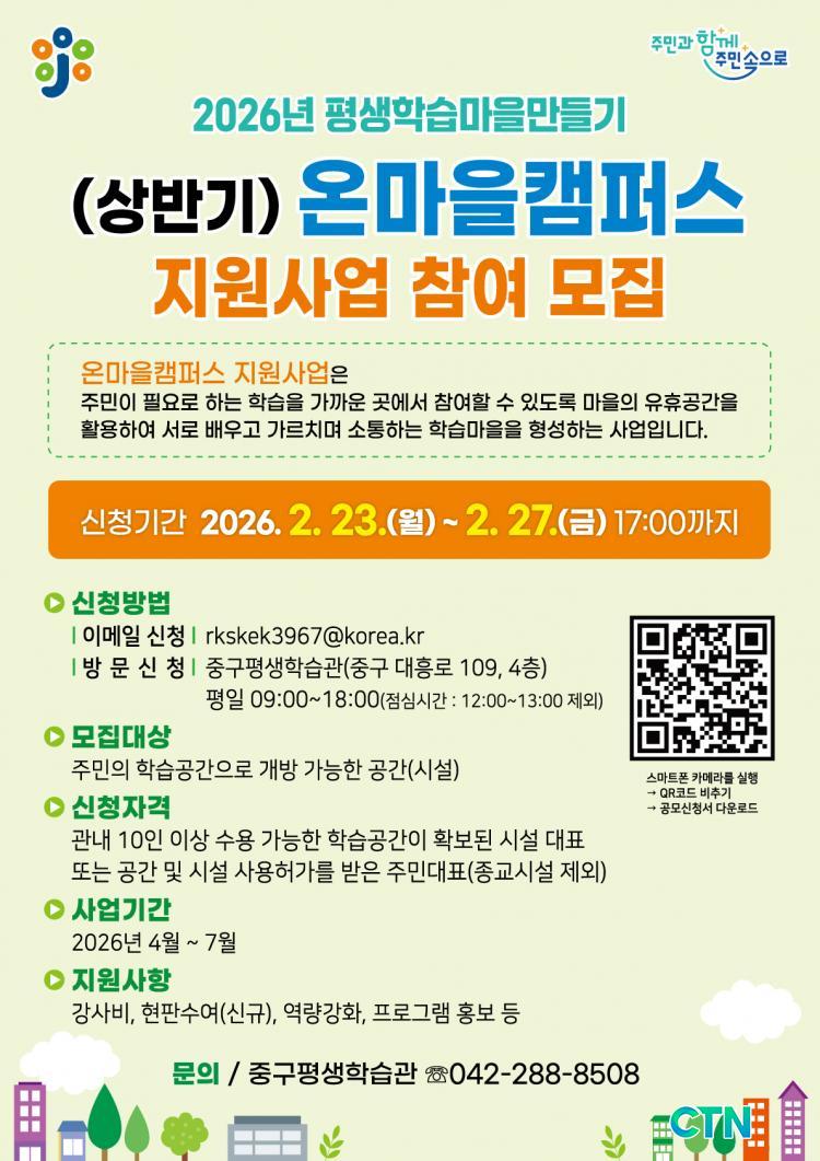 [´ëÀü/CTN]Á¤¹ÎÁØ ±âÀÚ¤Ó´ëÀü Áß±¸´Â ÁÖ¹ÎÀÌ ¸¶À» ³» °ø°£¿¡¼ ¼·Î ¹è¿ì°í °¡¸£Ä¡¸ç ¼ÒÅëÇÏ´Â Æò»ýÇнÀ »ýŰè Á¶¼ºÀ» À§ÇØ ¿À´Â 23ÀϺÎÅÍ 27ÀϱîÁö 2026³â »ó¹Ý±â ¿Â¸¶À»Ä·ÆÛ½º Áö¿ø»ç¾÷ Âü¿© ±â°ü 10°³¼Ò¸¦ ¸ðÁýÇÑ´Ù°í ¹àÇû´Ù.