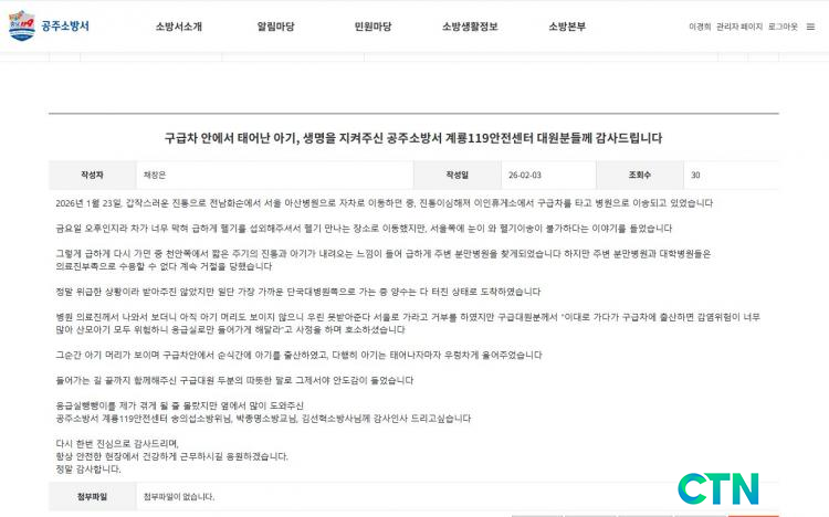 [°øÁÖ/CTN]ÀÌÀºÃá ±âÀÚ = Ãæ³² °øÁÖ¼Ò¹æ¼(¼Àå ¿À±àȯ)´Â Áö³´Þ 23ÀÏ ±ä±Þ ÀÌ¼Û ÁßÀÌ´ø ÀÓ»êºÎ°¡ ±¸±ÞÂ÷ ¾È¿¡¼ Ãâ»êÇÏ´Â ±ä¹ÚÇÑ »óȲ¿¡¼ ½Å¼ÓÇϰí Ä§ÂøÇÑ ´ëÀÀÀ¸·Î »ê¸ð¿Í ½Å»ý¾ÆÀÇ »ý¸íÀ» ¾ÈÀüÇÏ°Ô ÁöÄÑ³Â´Ù°í ¹àÇû´Ù.