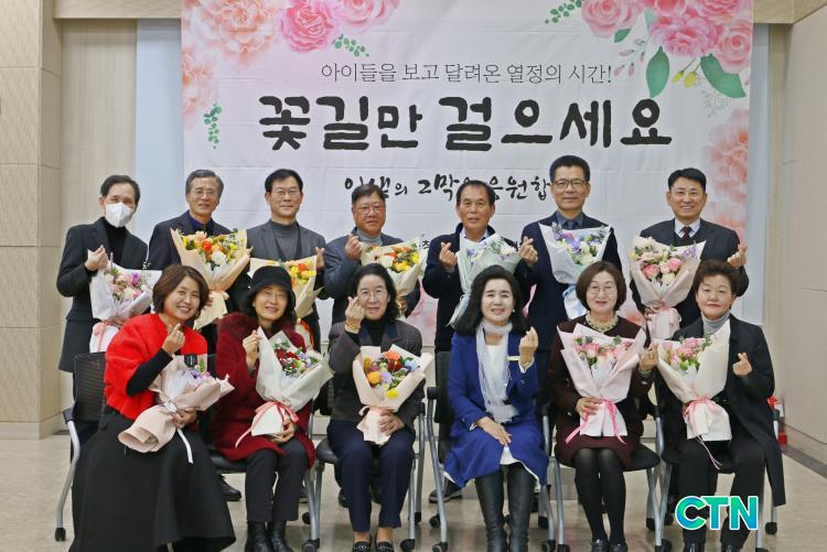 ÀÌ¾î ±³À°¿¡ ´ëÇÑ »ç¸í°¨°ú ¿Á¤À¸·Î ÂüµÈ ½º½ÂÀÇ »îÀ» »ì¾Ò´ø ÅðÁ÷ ±³¿ø 12¸íÀ» ´ë»óÀ¸·Î °¨»çÀÇ ¸¶À½À» ´ãÀº ¼Û°øÆÐ¸¦ ¼ö¿©ÇÏ¿´À¸¸ç, ÅðÁ÷±³¿øÀ» ´ëÇ¥ÇÏ¿© ´çÁøÃʵîÇб³ ±èÈñ¼÷ ±³Àå¼±»ý´ÔÀÇ ÅðÀӻ簡 À̾îÁ³´Ù.