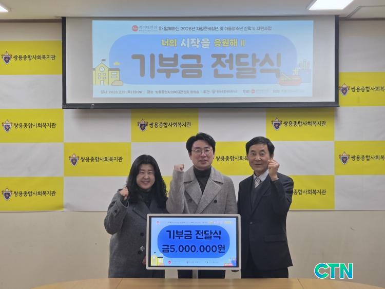 [õ¾È/CTN] °Çö¼ö ±âÀÚ = õ¾È½Ã ¼ºÏ±¸ ½Ö¿ëµ¿¿¡ À§Ä¡ÇÑ ±èÀÌžȰú(´ëÇ¥¿øÀå ±èÀÌÅÂ)°¡ Áö¿ª »çȸÀÇ ¹Ì·¡ÀΠû¼Ò³âµéÀ» À§ÇØ µû¶æÇÑ µîºÒÀ» ÀÚóÇÏ°í ³ª¼¹´Ù. ±èÀÌžȰú´Â Áö³ 19ÀÏ, ½Ö¿ëÁ¾ÇÕ»çȸº¹Áö°ü(°üÀå ±Ç°æ¾Æ)À» ¹æ¹®ÇØ ½ÅÇбâ Áغñ¸¦ À§ÇÑ ±âºÎ±Ý 500¸¸ ¿øÀ» Àü´ÞÇß´Ù°í ¹àÇû´Ù.