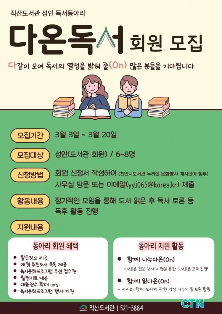 [õ¾È/CTN] °Çö¼ö ±âÀÚ = õ¾È½Ã Á÷»êµµ¼°üÀÌ È¥ÀÚ Àд µ¶¼¿¡¼ ¹þ¾î³ª ÀÌ¿ô°ú »ý°¢À» ³ª´©¸ç Ã¥ Àд Áñ°Å¿òÀ» ¸¸³£ÇÒ ¼ö ÀÖ´Â ¼ÒÅëÀÇ ÀåÀ» ¸¶·ÃÇß´Ù. µµ¼°üÀº ³»´Þ 3ÀϺÎÅÍ 20ÀϱîÁö ¼ºÀÎ µ¶¼µ¿¾Æ¸® ´Ù¿Âµ¶¼¿¡ Âü¿©ÇÒ Áö¿ª ÁÖ¹ÎÀ» ¸ðÁýÇÑ´Ù°í 26ÀÏ ¹àÇû´Ù. ´Ù¿Âµ¶¼´Â ´Ù °°ÀÌ ¸ð¿© µ¶¼ÀÇ ¿Á¤À» ÄÒ´Ù´Â Àǹ̸¦ ´ã°í ÀÖÀ¸¸ç Áö¿ª »çȸ ³» °Ç°ÇÑ µ¶¼ ¹®È¸¦ Á¤Âø½Ã۱â À§ÇØ ±âȹµÆ´Ù.