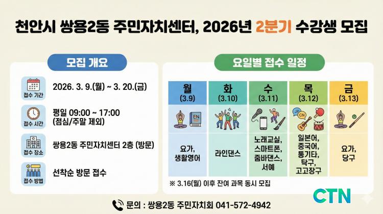 [õ¾È/CTN] °Çö¼ö ±âÀÚ = õ¾È½Ã ¼ºÏ±¸ ½Ö¿ë2µ¿ ÁÖ¹ÎÀÚġȸ°¡ Áö¿ª ÁֹεéÀÇ È°±âÂù ¿©°¡ »ýȰ°ú ÀÚ±â°è¹ßÀ» Áö¿øÇϱâ À§ÇØ 2026³âµµ 2/4ºÐ±â ÁÖ¹ÎÀÚÄ¡¼¾ÅÍ ÇÁ·Î±×·¥ ¼ö°»ýÀ» ¸ðÁýÇÏ¸ç ¸¶À» °øµ¿Ã¼¿¡ »õ·Î¿î Ȱ·ÂÀ» ºÒ¾î³Ö´Â´Ù. À̹ø ¸ðÁýÀº ¿À´Â 3¿ù 9ÀϺÎÅÍ 3¿ù 20ÀϱîÁö 2ÁÖ°£ ÁøÇàµÇ¸ç, ¹è¿ò¿¡ ¸ñ¸¶¸¥ Áֹε鿡°Ô ¿îµ¿ºÎÅÍ ¾îÇÐ, ¿¹¼úÀ» ¾Æ¿ì¸£´Â Æø³ÐÀº ±âȸ¸¦ Á¦°øÇÒ ¿¹Á¤ÀÌ´Ù.