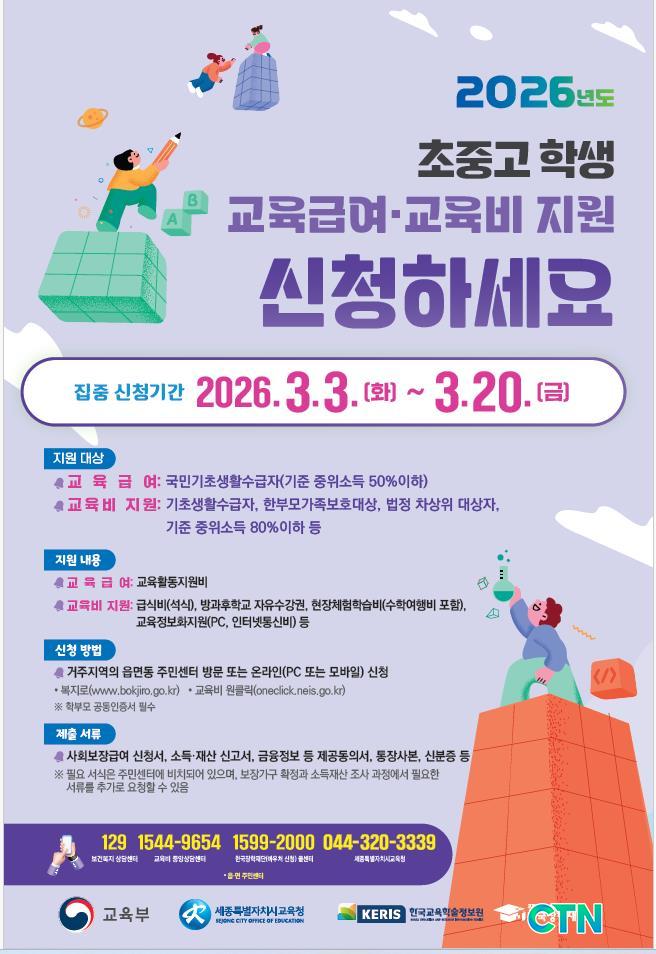 [¼¼Á¾/CTN]Á¤¹ÎÁØ ±âÀÚ¤Ó¼¼Á¾½Ã±³À°Ã»Àº Àú¼ÒµæÃþ °¡Á¤ÀÇ °æÁ¦Àû ºÎ´ãÀ» °æ°¨ÇÏ°í ±ÕµîÇÑ ±³À°±âȸ¸¦ º¸ÀåÇϱâ À§ÇØ 2026Çг⵵ ±³À°±Þ¿© ¹× ±³À°ºñ Áö¿ø »ç¾÷À» ÃßÁøÇÑ´Ù°í 3ÀÏ ¹àÇû´Ù.