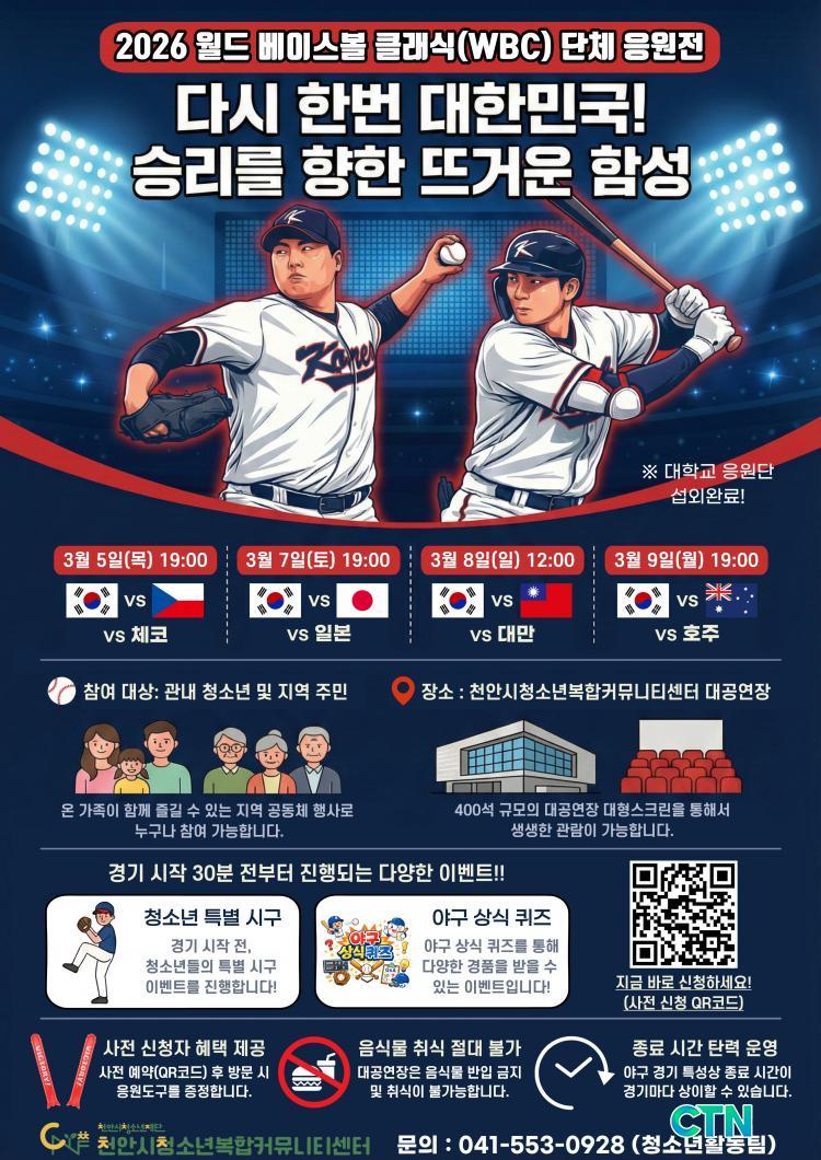 [õ¾È/CTN] °Çö¼ö ±âÀÚ = (Àç)õ¾È½Ãû¼Ò³âÀç´Ü »êÇÏ Ãµ¾È½Ãû¼Ò³âº¹ÇÕÄ¿¹Â´ÏƼ¼¾ÅͰ¡ 2026 ¿ùµå º£À̽ºº¼ Ŭ·¡½Ä(WBC) ´ëÇѹα¹ °æ±â ÀÏÁ¤¿¡ ¸ÂÃç ´ë±Ô¸ð ´Üü ÀÀ¿øÀüÀ» ¿î¿µÇÑ´Ù. À̹ø Çà»ç´Â û¼Ò³â°ú Áö¿ª ÁÖ¹ÎÀÌ ÇѸ¶À½À¸·Î ±¹°¡´ëÇ¥ÆÀÀ» ÀÀ¿øÇÏ¸ç °Ç°ÇÑ ½ºÆ÷Ã÷ ¹®È¸¦ Áñ±â°í Áö¿ª °øµ¿Ã¼ÀÇ À¯´ë°¨À» °ÈÇϱâ À§ÇØ ±âȹµÆ´Ù.