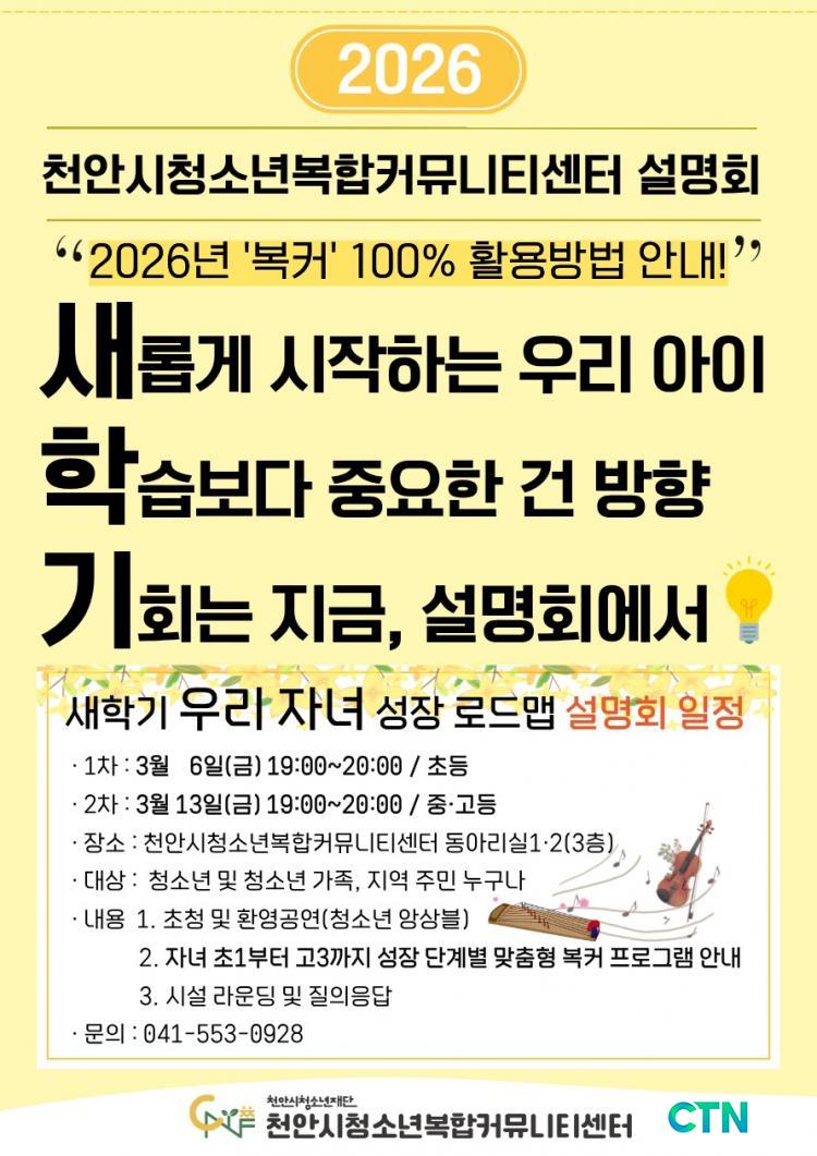 [õ¾È/CTN] °Çö¼ö ±âÀÚ = õ¾È½Ãû¼Ò³âÀç´Ü »êÇÏ Ãµ¾È½Ãû¼Ò³âº¹ÇÕÄ¿¹Â´ÏƼ¼¾ÅͰ¡ »õ Çб⸦ ¸Â¾Æ û¼Ò³âµéÀÇ °Ç°ÇÑ ¼ºÀåÀ» µ½°í Çкθðµé¿¡°Ô À¯ÀÍÇÑ ±³À° Á¤º¸¸¦ Á¦°øÇϴ Ưº°ÇÑ ÀÚ¸®¸¦ ¸¶·ÃÇß´Ù. ¼¾ÅÍ´Â ¿À´Â 6Àϰú 13ÀÏ µÎ Â÷·Ê¿¡ °ÉÃÄ ¡®»õ Çб⠿츮 ÀÚ³à ¼ºÀå ·Îµå¸Ê¡¯ ¼³¸íȸ¸¦ °³ÃÖÇÑ´Ù°í 5ÀÏ ¹àÇû´Ù.