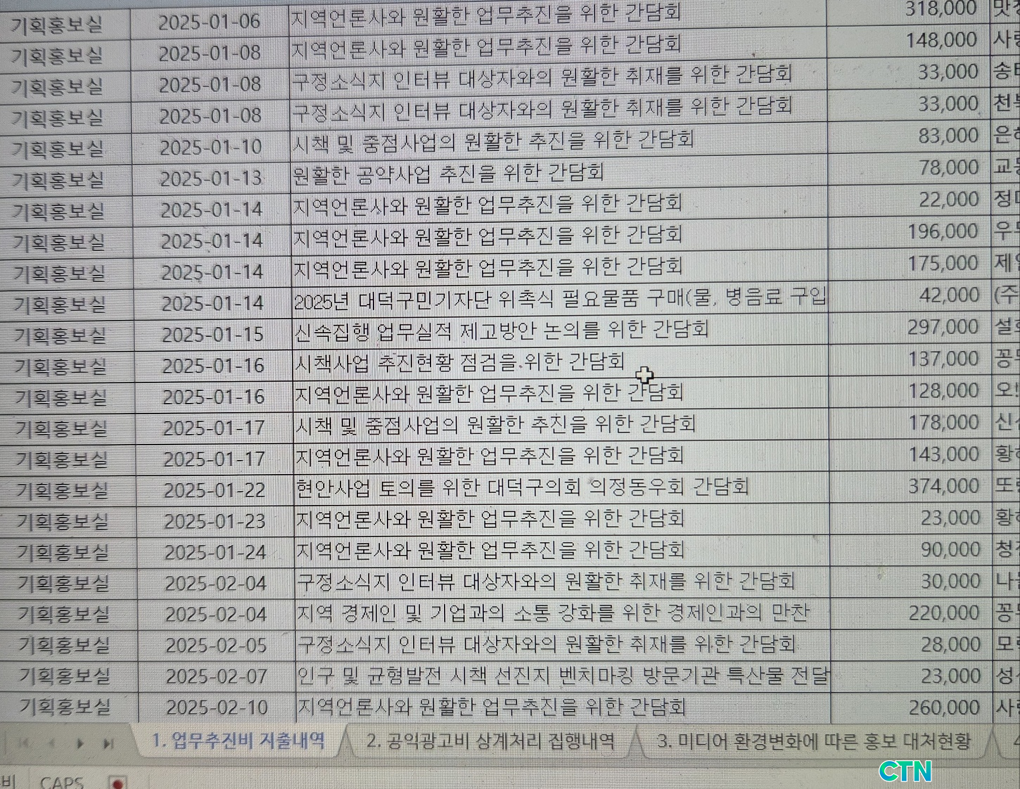 CTNÀÌ È®º¸ÇÑ 2025³â ±âȹȫº¸½Ç ¾÷¹«ÃßÁøºñ ÁýÇà ³»¿ª¿¡ µû¸£¸é ´ë´ö±¸´Â 1¿ùºÎÅÍ 2¿ù ¸»±îÁö ¾à 50¿© ÀÏ µ¿¾È µ¿ÀÏÇÑ ¸í¸ñÀÇ ¡®Áö¿ª¾ð·Ð»ç °£´ãȸ¡¯¸¦ ÃÖ¼Ò 9Â÷·Ê ÁøÇàÇß´Ù. °£´ãȸ´Â ´ëºÎºÐ Áö¿ª ½Ä´ç¿¡¼ ÀÌ·ïÁ³À¸¸ç °Ç´ç ¼ö½Ê¸¸ ¿ø ±Ô¸ðÀÇ ½Ä»ç ºñ¿ëÀÌ ¾÷¹«ÃßÁøºñ·Î °áÁ¦µÆ´Ù.
