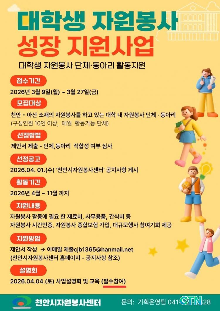 [õ¾È/CTN] °Çö¼ö ±âÀÚ = õ¾È½ÃÀÚ¿øºÀ»ç¼¾ÅͰ¡ ´ëÇлýµéÀÇ ÀÚÀ²ÀûÀÎ ºÀ»ç ¹®È¸¦ È®»êÇϰí Áö¿ª»çȸ¸¦ À̲ø¾î°¥ ¹Ì·¡ ÀÎÀ縦 ¾ç¼ºÇϱâ À§ÇØ ´ëÇлý ÀÚ¿øºÀ»ç ¼ºÀå Áö¿ø»ç¾÷ Âü¿© ´Üü¸¦ ¸ðÁýÇÑ´Ù. À̹ø »ç¾÷Àº ´ëÇлýµéÀÌ ºÀ»ç Ȱµ¿À» Á÷Á¢ ±âȹÇÏ°í ¿î¿µÇϸç Áö¿ª»çȸ ¹®Á¦ ÇØ°á¿¡ ÁÖµµÀûÀ¸·Î Âü¿©Çϵµ·Ï µ½´Â °ø¸ðÇü ÇÁ·Î±×·¥À¸·Î ¿À´Â 27ÀϱîÁö ½ÅûÀ» ¹Þ´Â´Ù.