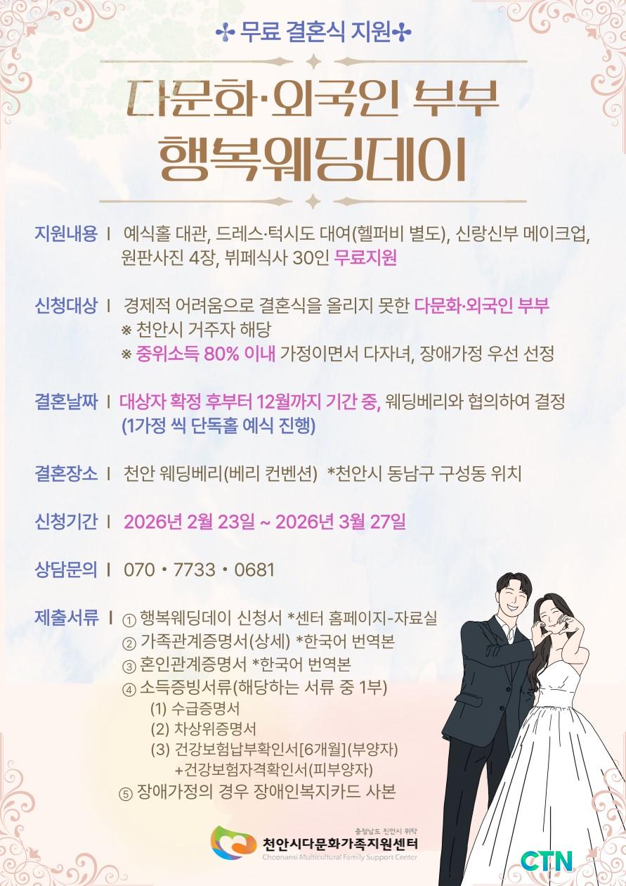 [õ¾È/CTN]°Çö¼ö ±âÀÚ = õ¾È½Ã¿Í õ¾È½Ã´Ù¹®È°¡Á·Áö¿ø¼¾ÅÍ(¼¾ÅÍÀå À±¿¬ÇÑ), ±×¸®°í Áö¿ª ´ëÇ¥ ¿þµùȦÀÎ ¿þµùº£¸®(ȸÀå À±¿ë¿ø)°¡ ¼ÕÀâ°í ´Ù¹®È¡¤¿Ü±¹ÀÎ ºÎºÎ¸¦ À§ÇÑ ²ÞÀÇ °áÈ¥½ÄÀÎ ¡®Çູ¿þµùµ¥ÀÌ¡¯ Áö¿ø »ç¾÷À» ÃßÁøÇÏ¸ç ´ë»óÀÚ ¸ðÁý¿¡ ³ª¼¹´Ù.