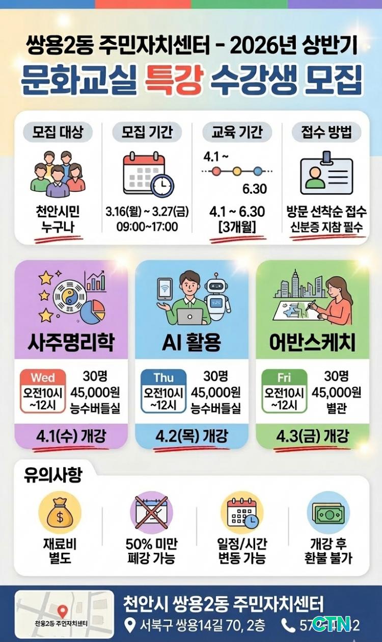 [õ¾È/CTN] °Çö¼ö ±âÀÚ = õ¾È½Ã ½Ö¿ë2µ¿ ÁÖ¹ÎÀÚġȸ(ȸÀå °ø¿µ´ö) ÁÖ¹ÎÀÚÄ¡¼¾ÅͰ¡ ½Ã¹ÎµéÀÇ Àڱ⠰è¹ß°ú ¹®È ÇâÀ¯ ±âȸ¸¦ È®´ëÇϱâ À§ÇØ ¡®2026³â »ó¹Ý±â ¹®È±³½Ç Ư° ÇÁ·Î±×·¥¡¯ ¼ö°»ýÀ» ¸ðÁýÇÑ´Ù°í ¹àÇû´Ù.